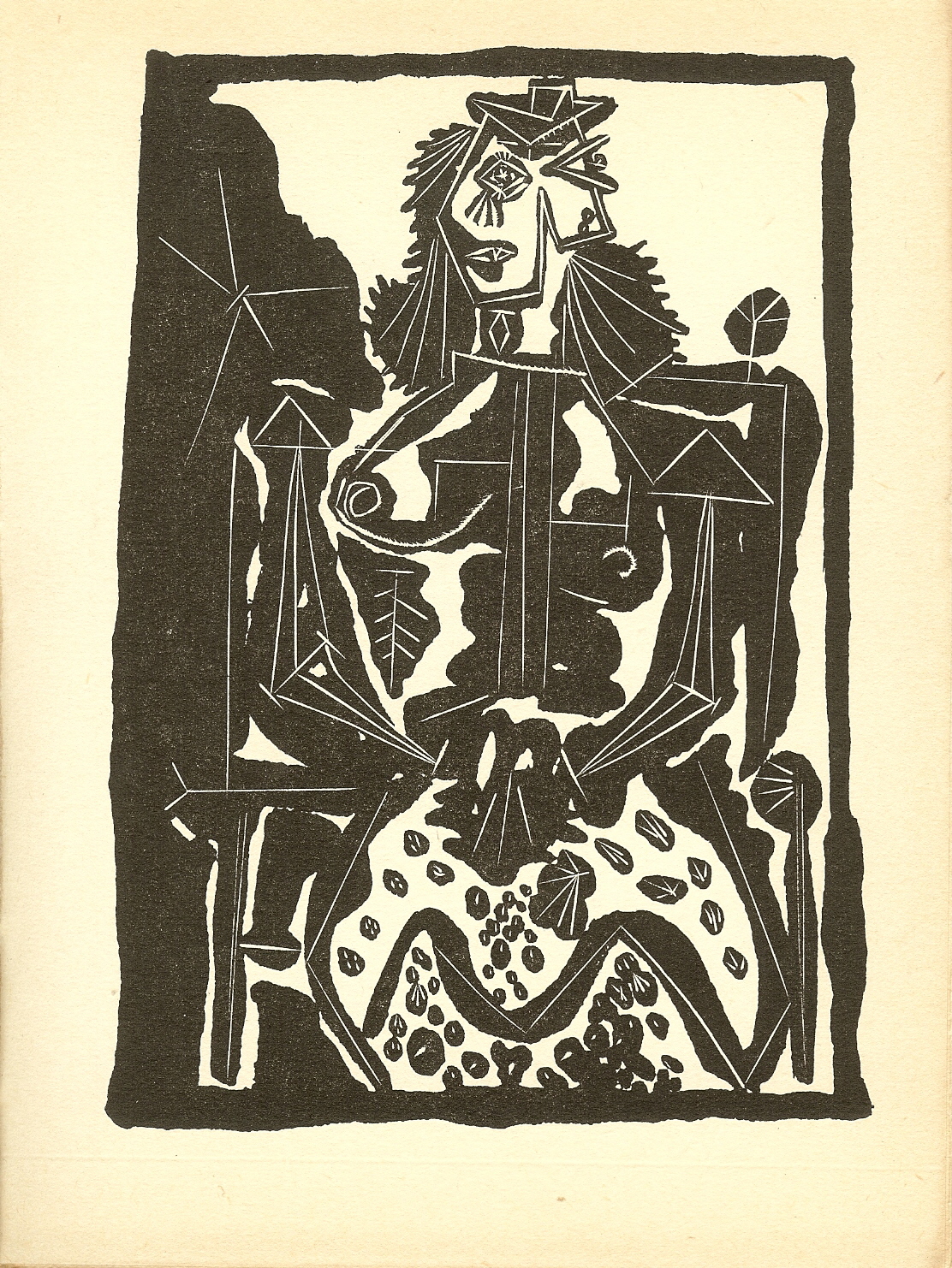 First edition. One of 400 numbered copies on vélin bouffant with four full-page engravings by Picasso. The colophon gives the technical details: "Les illustrations ont été gravées au burin par Pablo Picasso de manière à être imprimées dans le texte par les procédés typographiques courants." Goeppert/Cramer specify that the engravings are "zincographs reworked with engraving by the artist" The etchings refer to themes of Picasso's drawings and paintings of the late 1930s and early 1940s, the incisive presence of Dora Maar, full-face and seated in the chair, a woman walking towards the viewer, and a woman dancing. - Goeppert/Cramer 36.
