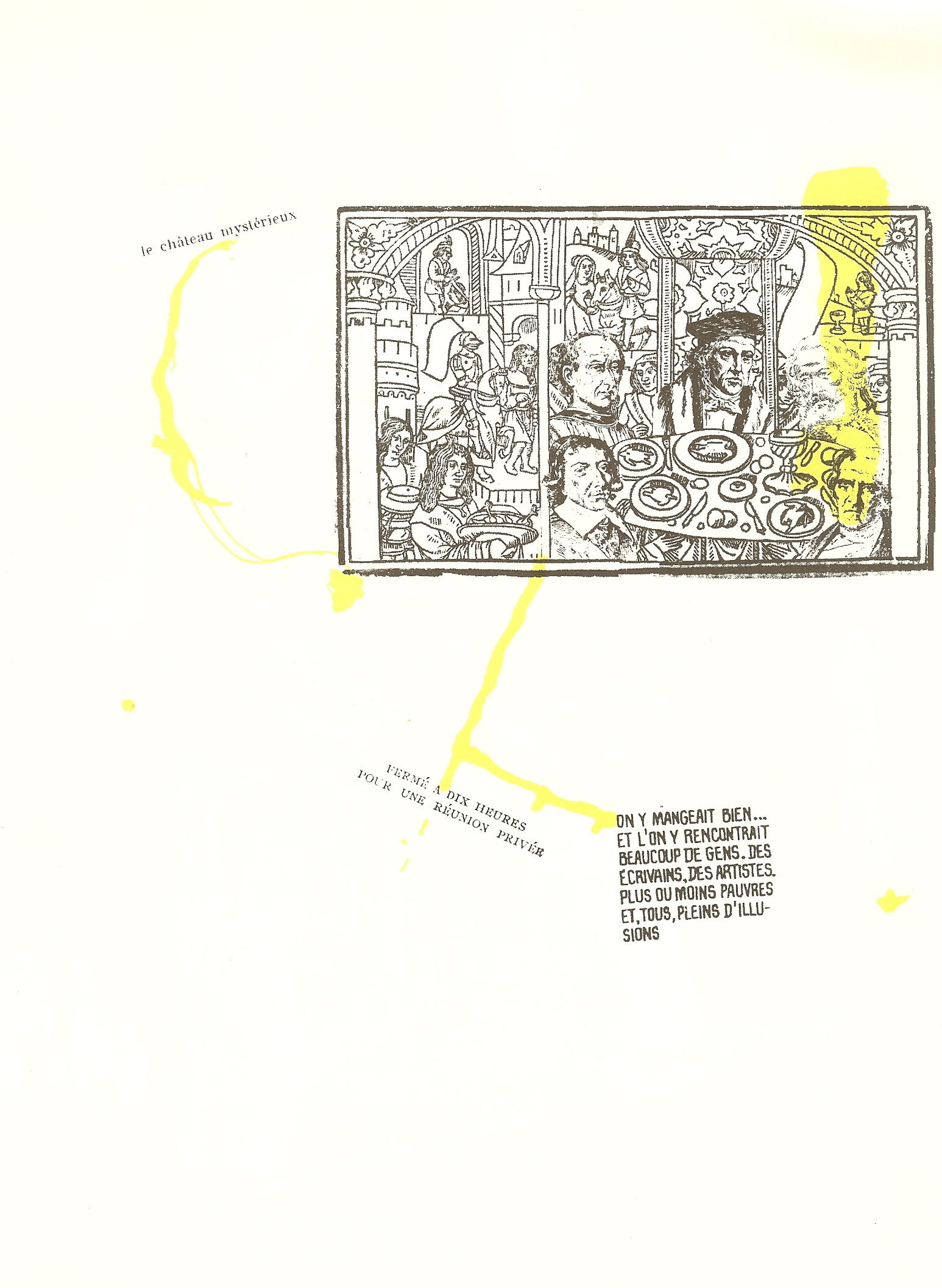 The warning on the title page 'Cet ouvrage est entièrement composé d'éléments préfabriqués' refers to the practice of détournement, developed by the Internationale Lettriste and adopted by the situationists. The images and texts, even if not one sentence is the author's, evoke the days and nights of the radical margins in Paris in the early 1950's, where Guy Debord was to mark the history of film with Hurlements en faveur de Sade in 1952, a film without images; where a group of not so recommendable youngsters decided to overthrow the world, an arrogant ambition which would lead to May 1968, and much further. Détournement, reusing fragments of existing culture or advertising in a critical context, is diametrically opposed to the later commercially successful odes of pop art to consumerism. Like Asger Jorn's colourful interventions are only reminders of Jackson Pollock's 'drippings', which turned out to be too 'aesthetic'. Jorn Druckgrafik 220.