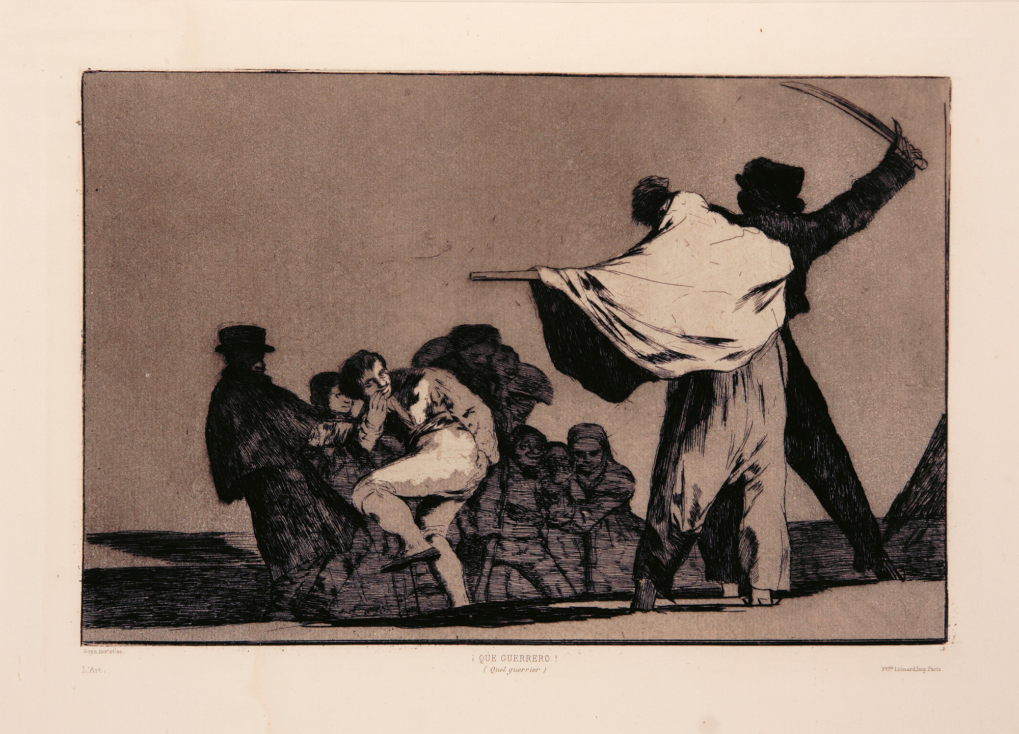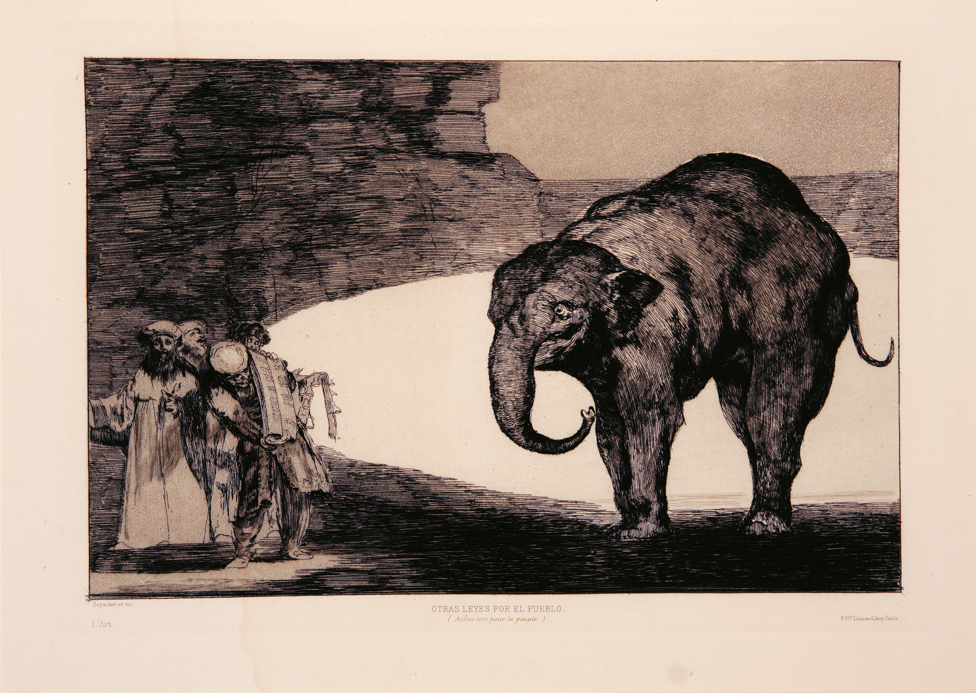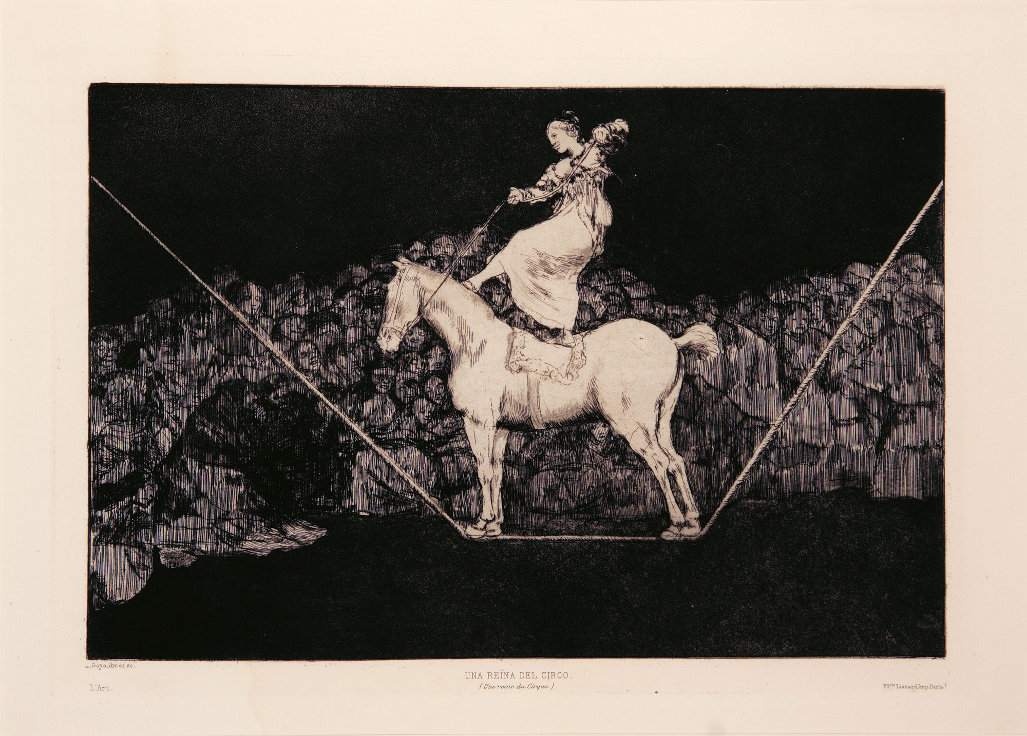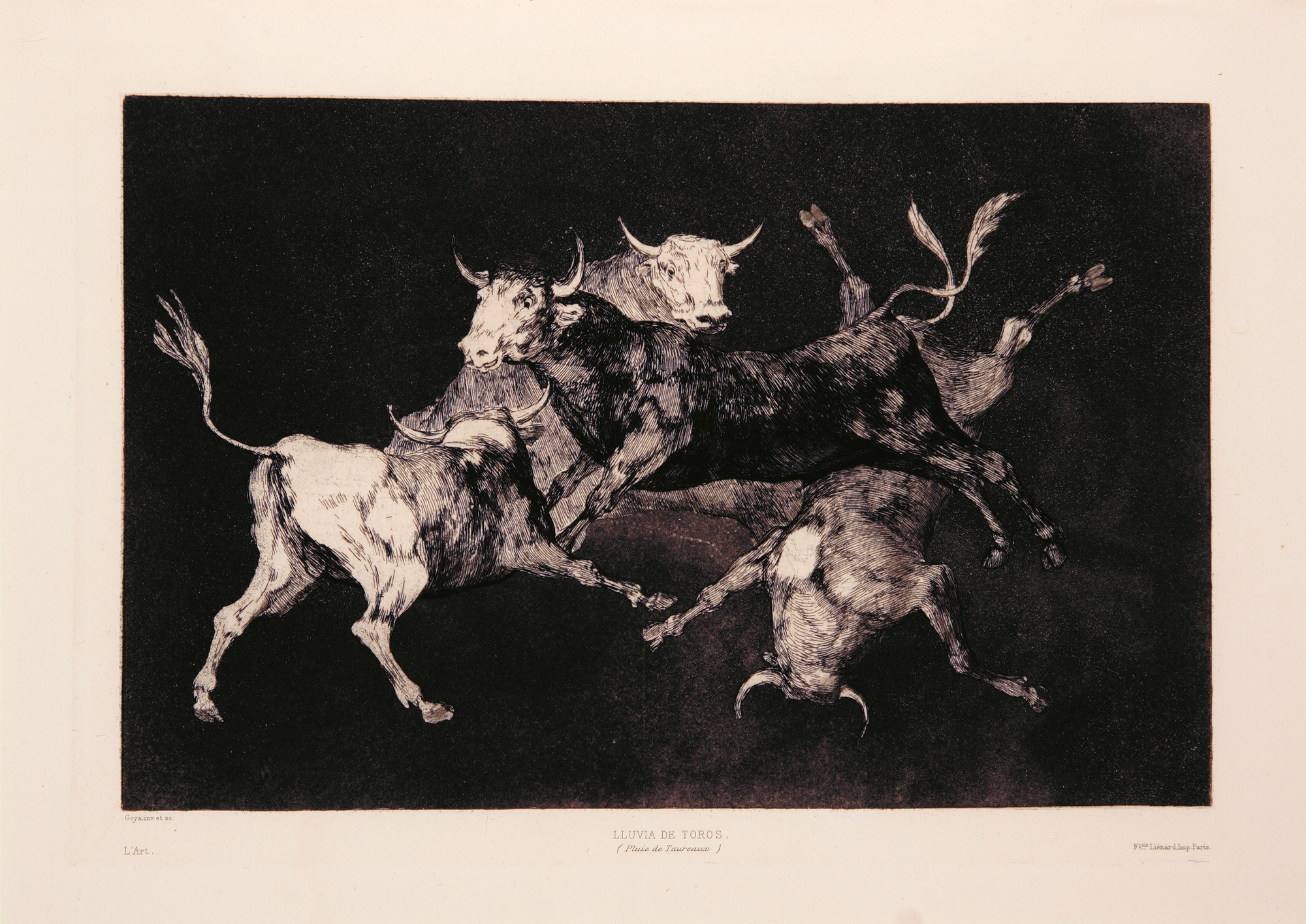 As published in L'Art. L'Art. Revue hebdomadaire illustrée. Paris/London, A Ballue, 1877. Troisième année, Tome II. The review’s 9th volume, 43 x 30,5 cm, 324pp., publisher's binding. Complete with Goya's four until then unpublished plates of the "Disparates" suite. Etching and burnished aquatint, 24,5 x 35 cm (plate size). Printed titles : Lluvia de Toros, facing p.6; Otras leyes por el Pueblo, facing p.40; Que Guerrero, facing p.56; Una Reina del Circo.